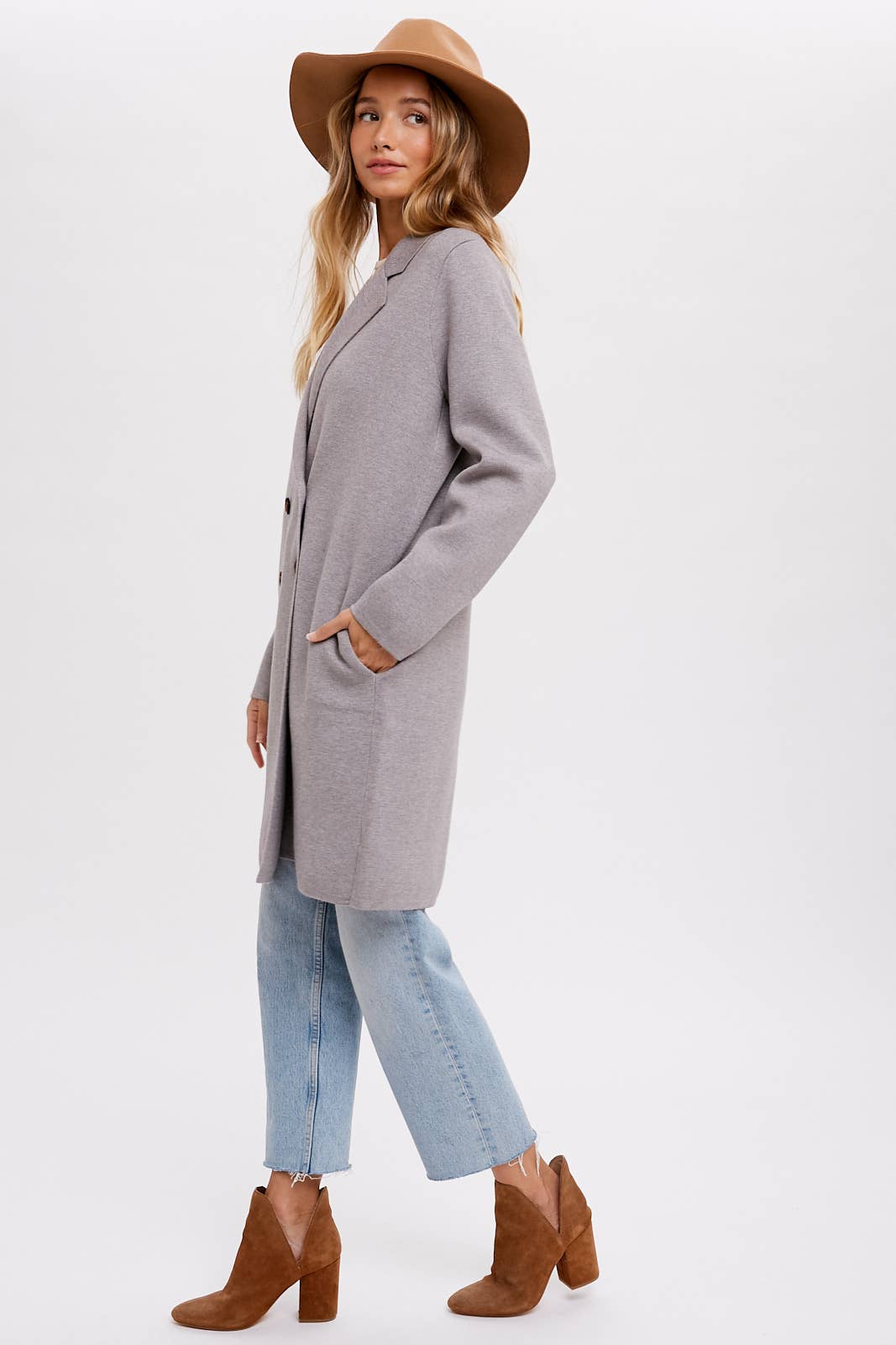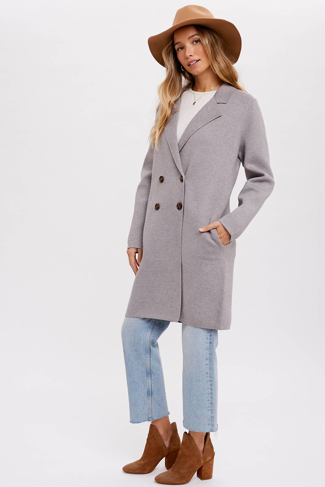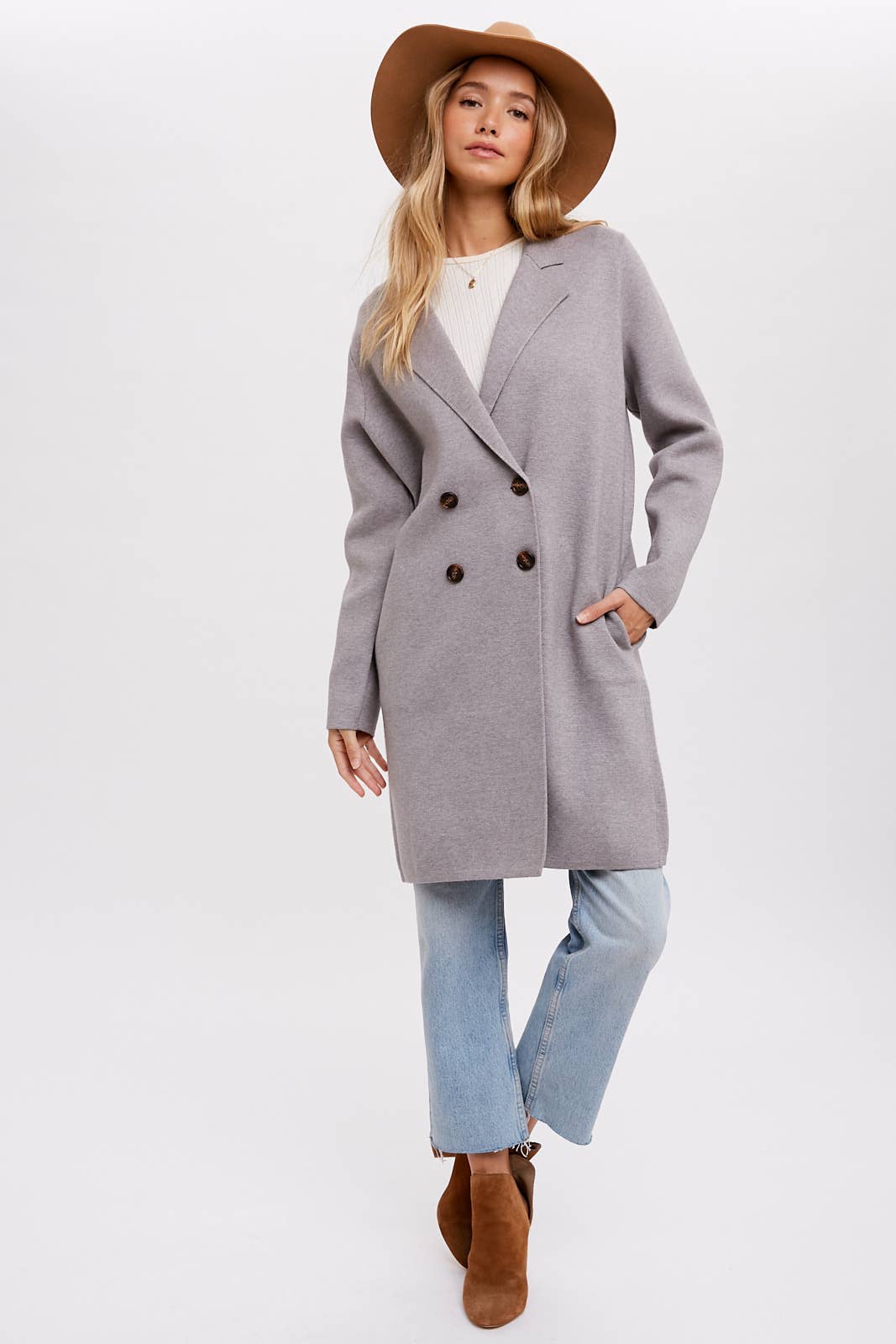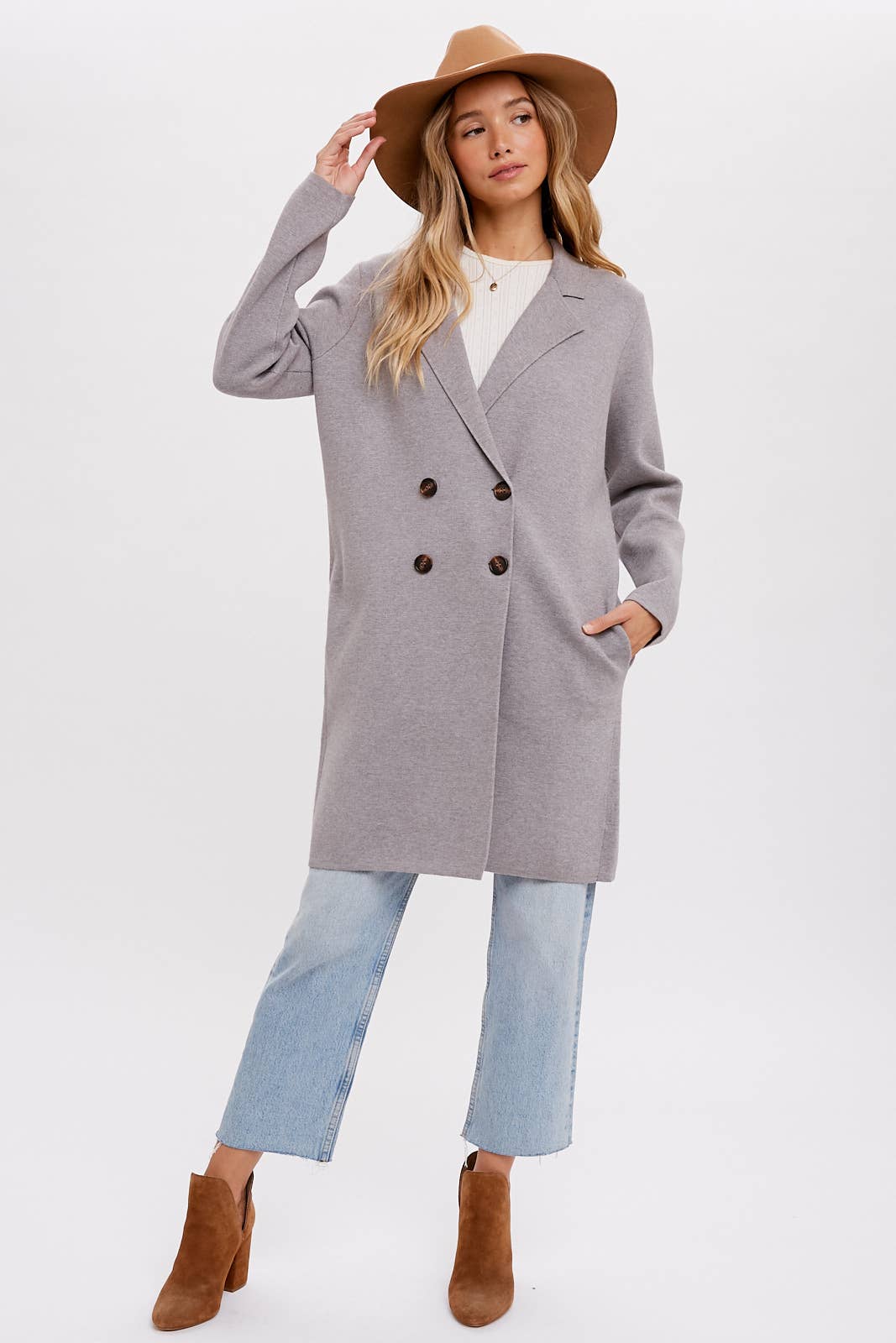 Introducing a timeless and sophisticated double-breasted long line coat that effortlessly elevates your style. This classic coat features a structured double-breasted front, adding a touch of elegance to your ensemble. With its longer length, it exudes an air of refinement and versatility. The coat comes with side pockets, offering practicality without compromising on aesthetics. It's a perfect combination of functionality and fashion, making it a staple piece for various occasions. Step into sophistication with this double-breasted long line coat, a versatile addition that complements both casual and dressier looks.